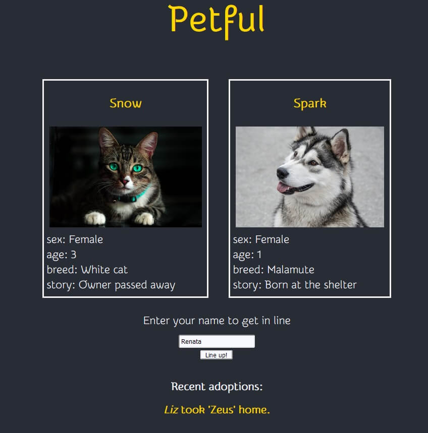 HappyPaws is an application that helps unit adopted pets with their new families. This was React based web application that helps coordinate the transfer of newly adopted pets to their permanent homes via a network of volunteer drivers. On the server site Docker for Windows was used to create a 3-node CockroachDB database cluster. Flyway was used, along with its Maven plugin, to execute SQL scripts for creating tables and inserting data. The server application runs on Spring Boot, and delivers a REST API. This application was selected the Winner of "HackOrTreat?" Hackathon in October 2020 under the submission of Best Use of CockroachDB. This was a group project and the credit goes to: Rory and Renata Dickinson.